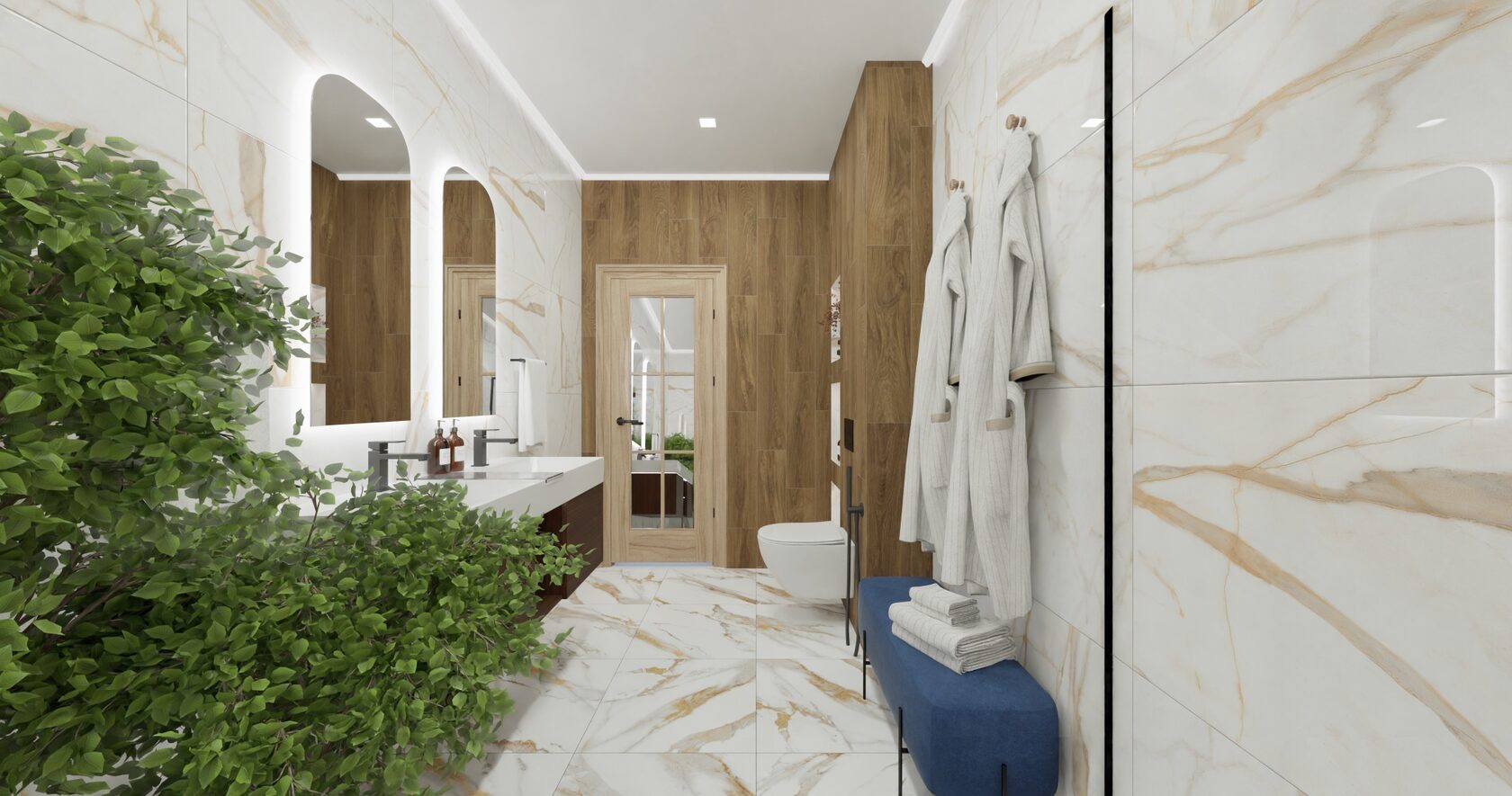 Крупное растение привносит настоящий эко‑настрой и сохраняет природный характер отделки. Живые листья красиво отражаются в подсвеченных зеркалах, создавая ощущение глубины и создавая эффект зимнего сада прямо в ванной комнате. Благодаря сочетанию натуральных фактур, продуманного света и мягких акцентов интерьер выглядит современно, но при этом очень непринужденно и расслабляюще.