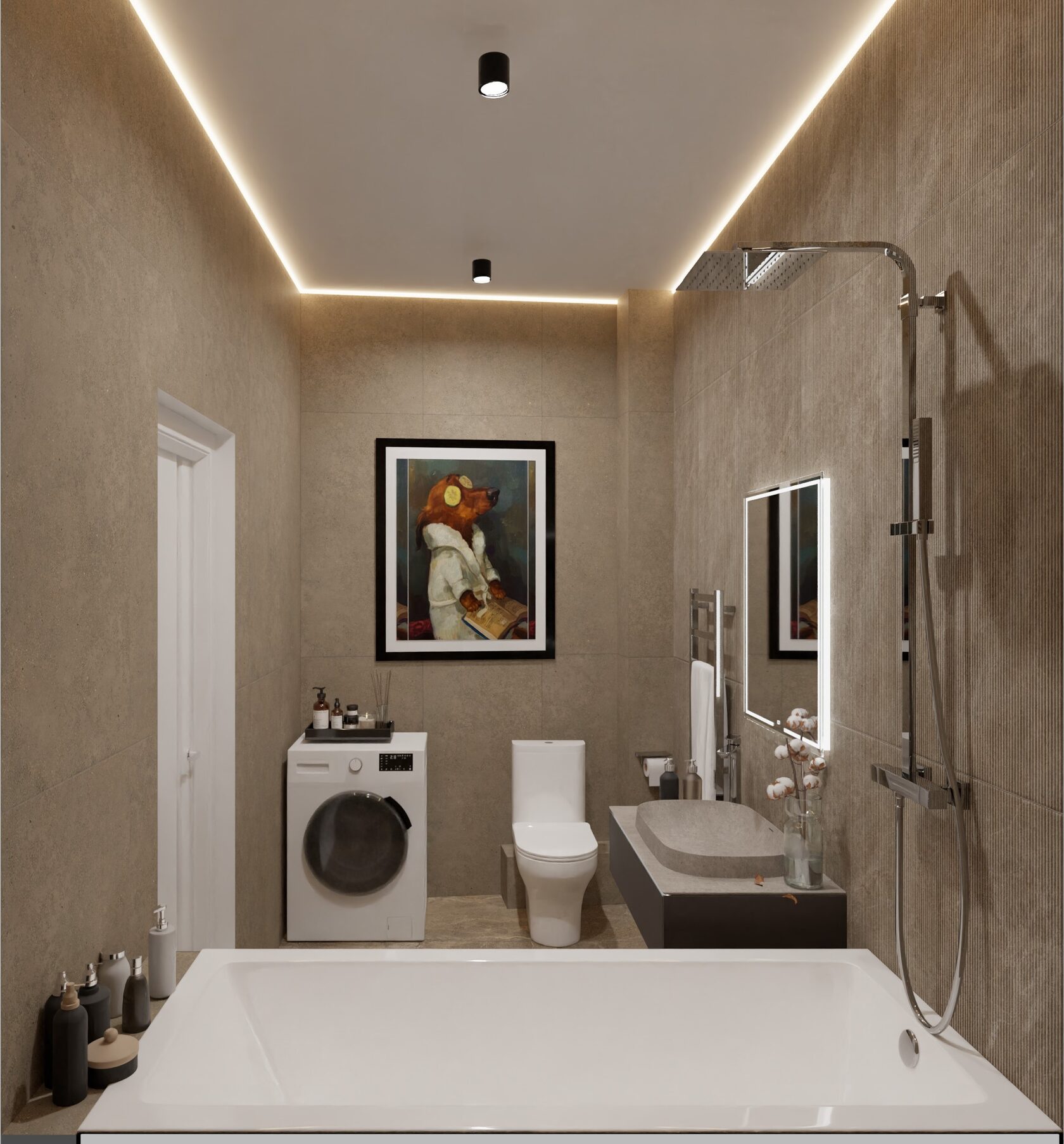 Ключевая деталь, придающая проекту индивидуальность, — крупная картина в черной рамке на торцевой стене: она создает фокусную точку и «оживляет» нейтральную бежевую палитру, не нарушая ее спокойствия. Декор создан с применением флаконов, диффузоров и лаконичных дозаторов на бортике ванны, поэтому интерьер остается чистым, собранным и в то же время нагревается, как личное, обжитое пространство.
