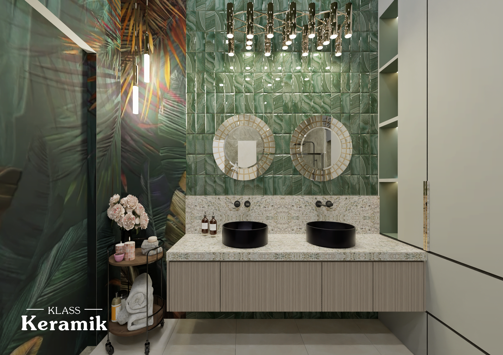 Ванная в стиле «городские джунгли» с изумрудной плиткой — это эффектное пространство, где насыщенные элементы сочетаются с современными технологиями и дизайнерскими приемами. Главный акцент - глянцевая зеленая плитка на стене у зеркал и тропическое декоративное панно — именно такие решения создают атмосферу экзотического оазиса, динамичного и уютного одновременно.